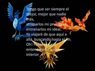 Este documento es la letra de la canción Pokémon en español. Habla sobre el viaje del protagonista para convertirse en el mejor entrenador Pokémon atrapándolos y entrenándolos todos. Su objetivo es atraparlos y entrenarlos a todos para salvar el mundo.