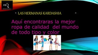 El documento presenta información sobre la tienda de ropa Las Hermanas Kardashia. Fue creada en 2012 por tres hermanas y se ha convertido en una de las mejores tiendas de moda en la ciudad. Ofrece una variedad de productos de alta calidad a precios accesibles. El documento también incluye la misión, visión, valores y objetivos de la empresa así como su estructura organizacional y expedientes de sus empleados.