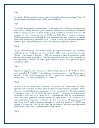 Este documento describe diferentes métodos para valuar inventarios, incluyendo el método promedio ponderado, PEPS y UEPS. Explica cómo aplicar cada método usando un ejemplo numérico con una tarjeta kardex para el artículo Q, mostrando cómo cambian los valores totales aunque las cantidades finales permanecen iguales.