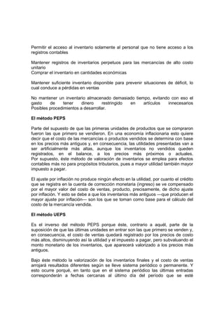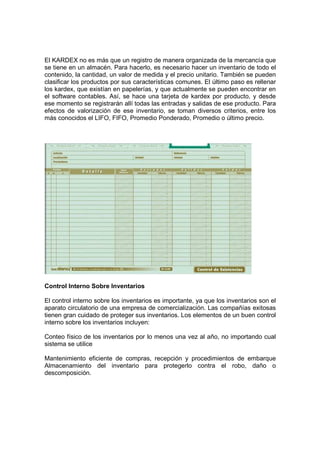 El kardex es un registro organizado de la mercancía en un almacén. Se hace un inventario clasificando los productos y anotando cantidades, precios y entradas/salidas. Actualmente los kardex se llevan en software contable. El control interno sobre inventarios es importante para protegerlos, incluyendo conteos físicos anuales y restricciones de acceso. Existen varios métodos para valuar inventarios como LIFO, FIFO y promedio ponderado.