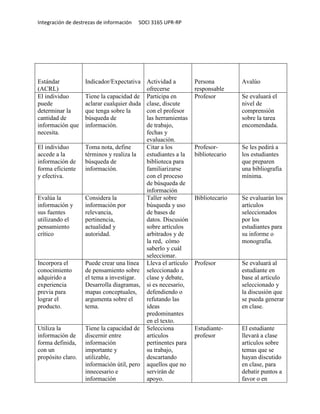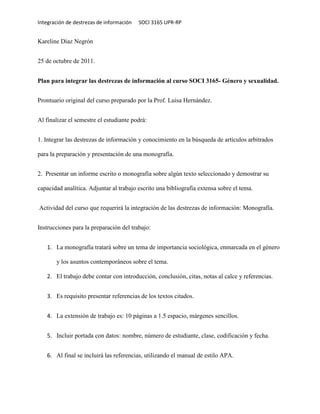 Este documento presenta un plan para integrar destrezas de información al curso SOCI 3165 Género y sexualidad en la UPR-Río Piedras. El plan propone que los estudiantes realicen una monografía utilizando artículos arbitrados encontrados en una búsqueda de información. Incluye instrucciones para la monografía y una tabla con estándares, indicadores, actividades y métodos de evaluación para integrar las destrezas de información al curso.