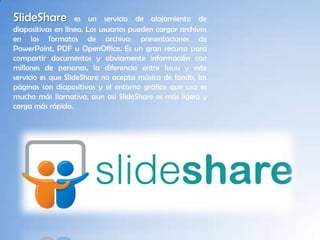 SlideShare es un servicio en línea para compartir presentaciones en formato PowerPoint, PDF u OpenOffice. Los usuarios pueden crear una cuenta gratuita, subir presentaciones de hasta 100MB y compartirlas a través de enlaces. SlideShare convierte las presentaciones a formato flash para que puedan verse en cualquier navegador web de forma interactiva, aunque no admite animaciones ni sonido. Es una herramienta útil para compartir información con otros de manera sencilla.