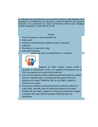 SlideShare es una plataforma gratuita donde los usuarios pueden subir presentaciones en formato PowerPoint u OpenOffice para compartirlas en línea. Los usuarios pueden administrar una cuenta para archivar, publicar y difundir sus presentaciones sin necesidad de adjuntar archivos pesados en correos. SlideShare también permite socializar presentaciones mediante enlaces y seleccionar presentaciones favoritas.
