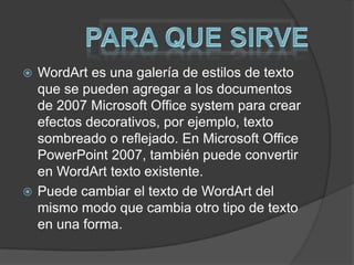 WordArt permite agregar estilos decorativos a texto en documentos de Microsoft Office 2007 como sombreado o reflejado. Se puede convertir texto existente en WordArt en PowerPoint 2007. Se selecciona el texto y se elige un estilo WordArt en la pestaña Insertar. Para quitar el estilo, se selecciona el texto WordArt y se hace clic en Borrar WordArt.