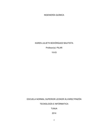 Este documento provee información sobre la carrera de ingeniería química en Colombia. Explica que la ingeniería química se enfoca en el desarrollo y optimización de procesos industriales que involucran reacciones químicas. Describe algunas universidades colombianas donde se puede estudiar esta carrera y menciona que su campo laboral incluye sectores como la industria, investigación ambiental y desarrollo tecnológico. Finalmente, concluye resaltando las amplias aplicaciones e impactos positivos de esta