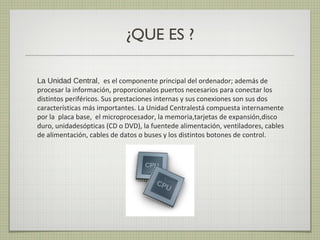 La unidad central de procesamiento (CPU) es el componente principal de una computadora. Contiene la placa base, el microprocesador, la memoria RAM, las tarjetas de expansión, el disco duro y otras partes. El microprocesador ejecuta los programas almacenados en la memoria RAM, mientras que la memoria RAM almacena temporalmente datos e información para que la CPU pueda procesarlos. Existen diferentes tipos de módulos de memoria RAM como SDRAM, DDR SDRAM y DDR3 SDRAM que permiten el acceso a la memoria