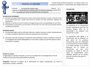 Este documento presenta una secuencia de actividades para elevar la autoestima de los estudiantes. Primero, los estudiantes observarán a compañeros con baja autoestima y discutirán sus características. Luego, crearán un estudio de caso ficticio sobre un estudiante con este problema. Finalmente, trabajarán en grupos para desarrollar una estrategia crítica para apoyar al estudiante del caso y mejorar su autoestima basada en investigaciones teóricas.