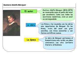El documento describe las características generales del Romanticismo en España, incluyendo su contexto histórico, aspectos literarios como temas, géneros y autores prominentes. Resalta la libertad de expresión, el culto al yo individual y la naturaleza, así como la influencia de autores europeos. Entre los autores románticos españoles más destacados se encuentran José de Espronceda, José Zorrilla, Gustavo Adolfo Bécquer y Rosalía de Castro.