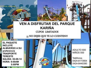 Este documento anuncia un viaje al Parque Kariña el 2 de agosto a las 9:00 am hasta las 5:00 pm. El paquete incluye almuerzo, transporte terrestre y entrada al parque. Los cupos son limitados y los precios son de 600 para adultos y 550 para niños. Se proporcionan dos números de teléfono para realizar reservaciones con el 50% de anticipo.