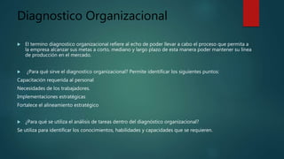 El documento trata sobre conceptos clave para el diagnóstico y mejora organizacional como cultura organizacional, comportamientos, normas, valores, filosofía empresarial, clima laboral, reglas, evaluación de desempeño, mejora continua y reingeniería. Explica que el diagnóstico permite identificar necesidades y fortalecer el alineamiento estratégico, mientras que la mejora y reingeniería buscan mejorar procesos y resultados de manera radical.