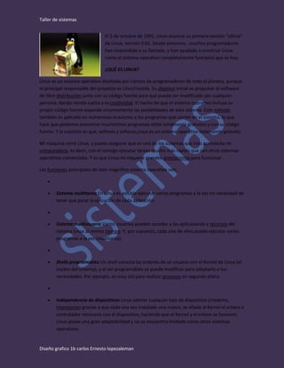Linux es un sistema operativo libre y de código abierto compatible con Unix. Fue creado originalmente por Linus Torvalds y ha sido desarrollado por muchos programadores de todo el mundo. Linux se distribuye gratuitamente y viene con su código fuente, lo que permite modificarlo y adaptarlo a diferentes necesidades. Es multiusuario, multitarea y compatible con múltiples plataformas hardware.