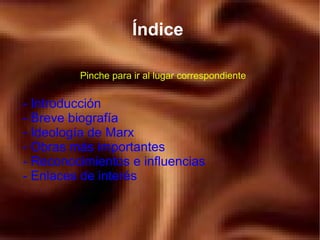 El documento presenta una breve biografía y resumen de las ideas y obras más importantes de Karl Marx, el filósofo y pensador alemán considerado el padre del socialismo científico y el marxismo. Marx formuló la teoría de la lucha de clases y creía en la inevitabilidad de una sociedad sin clases tras una dictadura del proletariado. Sus obras más influyentes incluyen El Capital y el Manifiesto Comunista, escrito con Engels. Marx tuvo una gran influencia en el pensamiento político y es consider