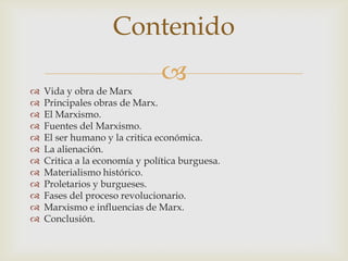 El documento resume la vida y obra de Karl Marx, incluyendo sus principales escritos como El Manifiesto Comunista y El Capital. Explica las ideas centrales del marxismo como el materialismo histórico, la alienación, la lucha de clases entre proletarios y burgueses, y cómo Marx analizó y criticó la economía política burguesa de su época.