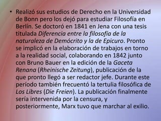 Karl Marx realizó estudios de Derecho y Filosofía en varias universidades alemanas. Más tarde se involucró en el periodismo y la elaboración de trabajos sobre temas sociales. Debido a la censura, Marx tuvo que exiliarse en París y Bruselas, donde conoció a Engels y desarrolló sus ideas socialistas y comunistas. Escribió obras fundamentales como los Manuscritos económicos y filosóficos y el Manifiesto Comunista con Engels. Marx se dedicó a estudiar economía política y a organ