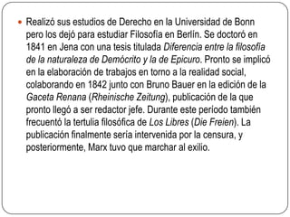 Karl Marx realizó estudios de Derecho y Filosofía en varias universidades alemanas. Colaboró en publicaciones periodísticas y conoció a otros pensadores socialistas. Escribió obras teóricas como los Manuscritos económicos y filosóficos y el Manifiesto Comunista con Engels. Fundó la Liga de los Comunistas y se estableció en Londres, donde escribió su obra capital El Capital. Marx participó en la Primera Internacional y desarrolló el método dialéctico y la teoría del material