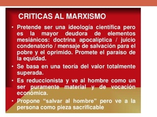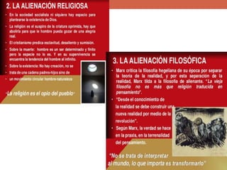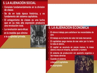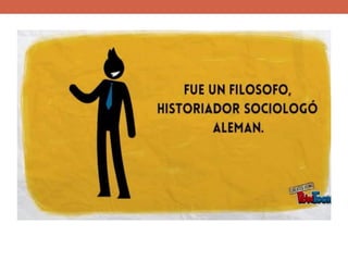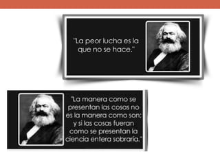 Karl Marx nació en 1818 en Alemania. Estudió derecho y filosofía y desarrolló una visión materialista y atea del mundo. Escribió obras influyentes como El Manifiesto Comunista y El Capital, donde analizó la sociedad capitalista y predijo su colapso debido a las contradicciones internas del sistema. Marx pasó gran parte de su vida en el exilio, principalmente en Londres, donde murió en 1883 siendo uno de los pensadores políticos y económicos más importantes del siglo XIX.