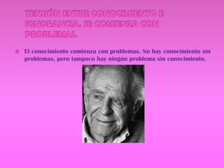La tensión entre el conocimiento y la ignorancia lleva a la formulación de problemas y ensayos de solución. El método científico implica proponer soluciones a través de ensayos y someterlas a una crítica objetiva con el fin de refutarlas o aceptarlas provisionalmente. La objetividad radica en la tradición crítica que permite cuestionar dogmas dominantes.