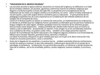 El documento discute la importancia de la educación en México a través de la historia. Explica que las antiguas civilizaciones mesoamericanas como los aztecas ya tenían instituciones educativas establecidas. Con la llegada de los españoles, la educación se centró en la alfabetización y formación religiosa a través de escuelas católicas. Aunque hubo prohibiciones, algunos indígenas pudieron estudiar en la Universidad de México. El documento también describe los esfuerzos por mejorar la educación durante el Por