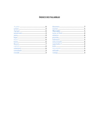 Este documento explica cómo crear marcadores e índices de contenido en Microsoft Word. Explica que los marcadores identifican posiciones de texto a las que se puede acceder rápidamente y que sirven de base para crear referencias cruzadas. También describe cómo insertar marcadores siguiendo pasos sencillos como posicionarse en el texto y seleccionar la opción Marcador en la pestaña Insertar. El documento termina con un índice de contenido que lista los temas principales cubiertos.