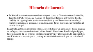 El documento describe el conjunto de templos de Karnak en Egipto. Consiste en varios templos rodeados por muros de ladrillos, destacando el Gran Templo de Amón que ocupa 30 hectáreas y es el más antiguo. El templo se ha conservado mejor que los demás. El documento también menciona otros templos como el de Ptah, Ramsés III y Khonsu, así como un lago sagrado.