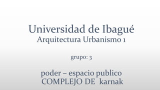 El documento describe el Complejo de Karnak en Egipto, que era el centro religioso más importante del Antiguo Egipto. Estaba dedicado principalmente al culto del dios Amón. El complejo consistía en varios templos y estructuras ordenadas de acuerdo a la jerarquía social egipcia, con las áreas más privadas solo accesibles a las clases altas. La disposición y tamaño de los elementos arquitectónicos como puertas, columnas y salas reflejaban la división social del espacio.
