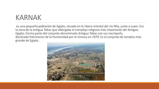 La ciudad de Karnak en Egipto era el sitio del complejo religioso más importante del Antiguo Egipto. Consistía en un gran conjunto de templos declarado Patrimonio de la Humanidad por la UNESCO en 1979. Era el conjunto de templos más grande de Egipto y formaba parte de la antigua Tebas junto con sus necrópolis.