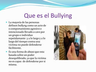 Este documento describe el bullying y el cyberbullying, incluidas sus definiciones, formas, efectos y categorías. El bullying implica actos agresivos repetidos contra una víctima indefensa, mientras que el cyberbullying ocurre en línea y puede ser anónimo. Ambos pueden causar daños físicos y psicológicos como baja autoestima y depresión. El cyberbullying incluye acciones como enviar mensajes ofensivos, crear páginas de Internet dañinas o excluir a alguien de un grupo en línea.