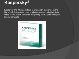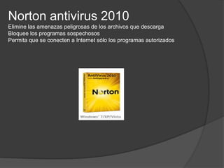 Este documento compara varios antivirus gratuitos y de pago, describiendo brevemente sus características principales como la detección y eliminación de malware, actualizaciones, protección en tiempo real y compatibilidad con diferentes sistemas operativos. Los antivirus mencionados incluyen Kaspersky Puro, Norton Antivirus 2010, AVG Anti-Virus Free, ActiveScan 2.0, Eset Nod32 Antivirus 4, Antivirus Antivir, Nod 32 Antivirus y Avast Free Antivirus.
