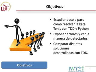 Este documento presenta una introducción a la kata de programación conocida como "Tenis". Se explica brevemente las reglas básicas del tenis que se utilizarán en la kata. Luego, se detalla el índice de la presentación, la cual cubrirá temas como repaso de desarrollo guiado por pruebas (TDD), la implementación paso a paso de la kata utilizando TDD, diferentes soluciones desarrolladas y conclusiones. Finalmente, se mencionan objetivos como estudiar cómo resolver la kata con TDD en Python, exponer erro