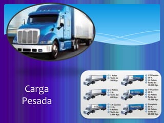 Este documento describe diferentes tipos de carga para transporte, incluyendo carga pesada, carga refrigerada y carga por volumen, así como el transporte económico de mercancías.