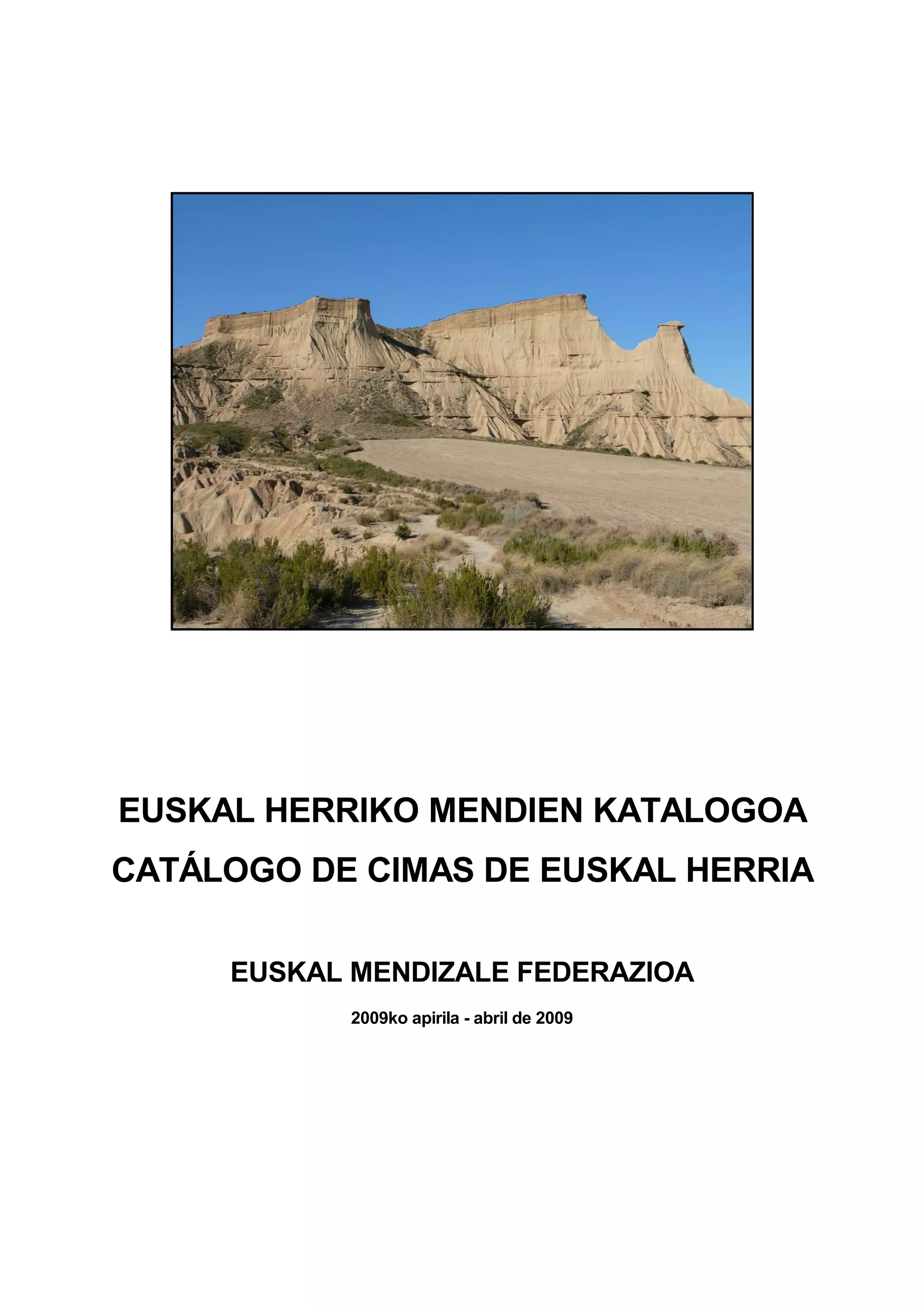 Este documento presenta el Catálogo de Montes de Euskal Herria, que incluye una lista de las principales montañas de cada territorio histórico del País Vasco, así como una lista de las cumbres más importantes de la Península Ibérica. Se explica que el catálogo ha sido revisado varias veces desde su primera edición en 1950 para actualizar datos y añadir nuevas montañas, siempre manteniendo los criterios de importancia y representatividad. El documento también destaca la importancia que tiene el Catálogo y el Concurso de los