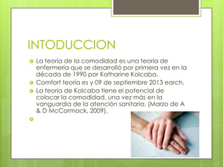 La teoría de la comodidad fue desarrollada por Katharine Kolcaba en la década de 1990. Describe el confort como existiendo en tres formas: alivio, tranquilidad y trascendencia. Kolcaba también identificó cuatro contextos en los que puede ocurrir la comodidad del paciente: físico, psicoespiritual, ambiental y sociocultural. La teoría propone que la enfermería evalúe las necesidades de confort del paciente, implemente intervenciones y evalúe los niveles de comodidad, con el objet