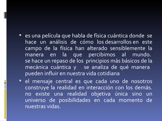 La película analiza cómo los desarrollos en la física cuántica han cambiado nuestra percepción del mundo y muestra cómo sus principios básicos pueden afectar nuestra vida diaria, con el mensaje central de que construimos la realidad en interacción con los demás en lugar de una realidad objetiva única. También explora la relación entre la observación y la realidad tanto en la física cuántica como en el método científico.