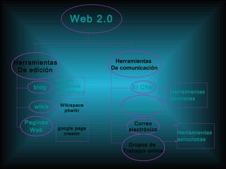 Este documento presenta diferentes herramientas de comunicación y edición de la Web 2.0 como blogs, wikis, páginas web y herramientas de edición. También describe brevemente cómo crear y usar blogs en Blogger y WordPress, así como wikis en Wikispaces y pbwiki. Finalmente, explica las diferencias entre herramientas de comunicación síncronas y asíncronas.