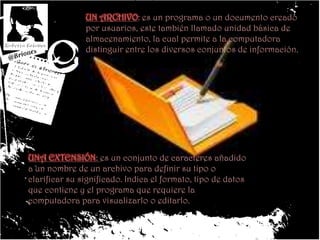 Un archivo es un programa o documento creado por usuarios que permite distinguir entre conjuntos de información. Una extensión indica el formato y programa necesario para abrir un archivo. Existen archivos ejecutables y de datos, así como extensiones para texto, imágenes, audio, video, programas e internet.