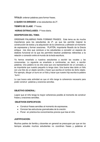 Este documento describe una actividad para enseñar a estudiantes de segundo grado a ordenar palabras para formar frases. La actividad les permite mejorar la construcción de textos y la coherencia al expresarse. El objetivo es que los estudiantes puedan construir frases y oraciones sencillas de manera coherente. La actividad propone ordenar grupos de palabras para formar oraciones con sentido.