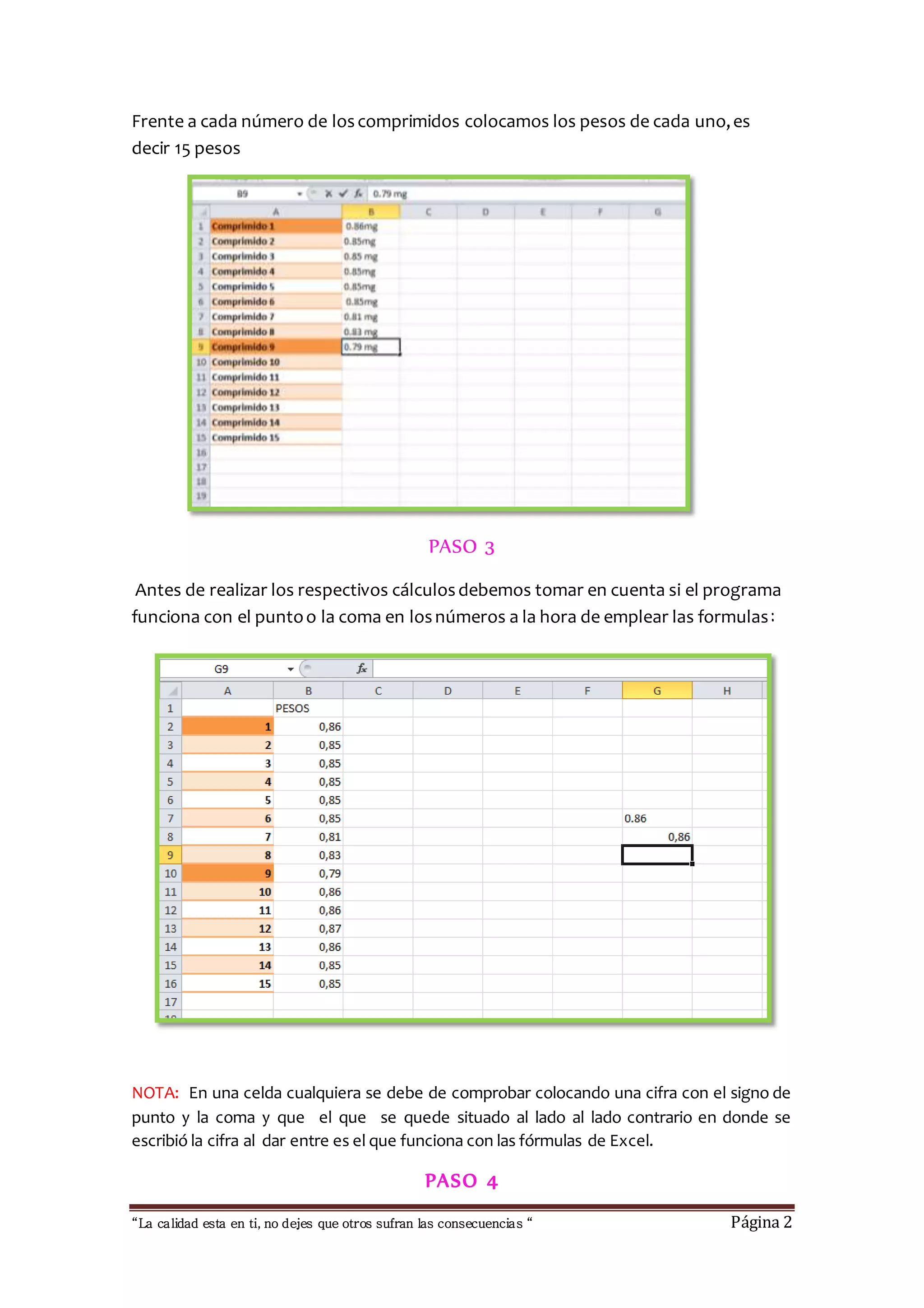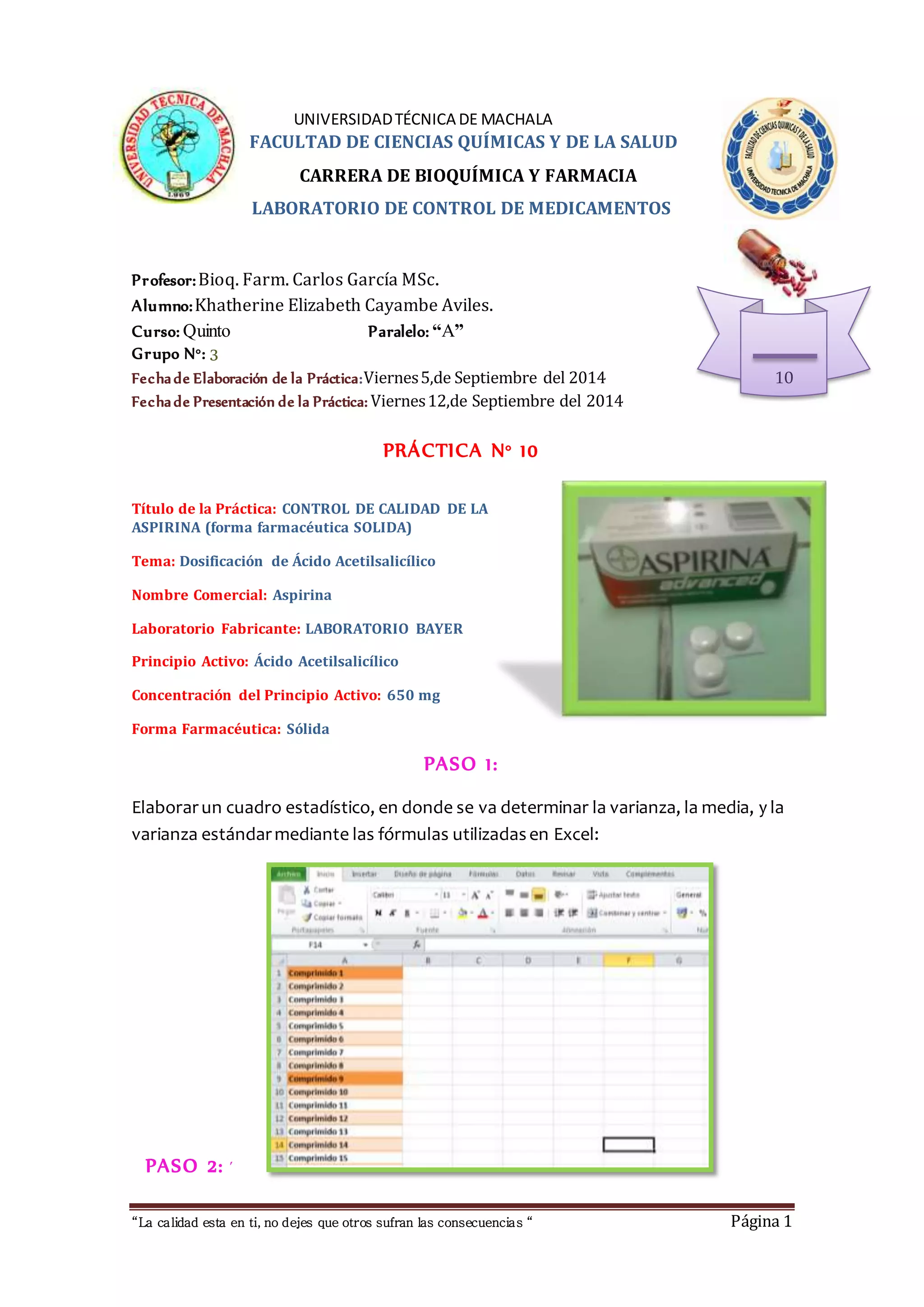 Este documento describe los pasos realizados en un laboratorio para realizar el control de calidad de aspirinas mediante la dosificación del principio activo ácido acetilsalicílico. Se pesaron 15 comprimidos y se calcularon estadísticas como la media, varianza y desviación estándar usando fórmulas en Excel. Luego se graficaron los resultados y se establecieron límites inferiores y superiores para verificar que el contenido de principio activo estuviera dentro de los rangos permitidos.