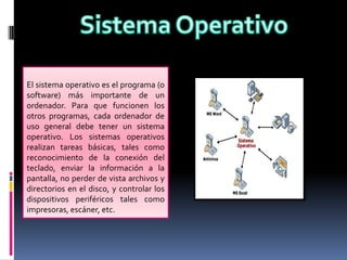 El sistema operativo es el programa más importante de un ordenador. Realiza tareas básicas como reconocer el teclado y la pantalla, administrar archivos y directorios, y controlar periféricos. Sin un sistema operativo, los demás programas no podrían funcionar.