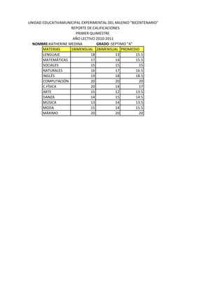 El reporte de calificaciones de Katherine Medina en el primer quimestre del año escolar 2010-2011 muestra sus calificaciones en 12 materias, con puntajes que van de 13.5 a 20 en una escala de 0 a 20, destacándose en Computación e Inglés con calificaciones de 20 y 18.5 respectivamente.
