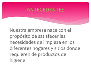 La empresa se enfoca en satisfacer las necesidades de limpieza de hogares y otros sitios a través de productos de higiene de alta calidad. Su misión es ser líder en soluciones de limpieza mediante la expansión de su portafolio de productos innovadores, y su visión es distribuirlos en más barrios y colonias para cumplir con sus objetivos de mercadeo.