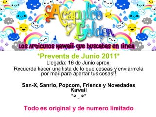 El documento es una preventa de productos kawaii, con artículos originales de Sanrio y San-X disponibles para reserva hasta el 16 de junio de 2011. Incluye detalles de precios, métodos de pago y condiciones de envío, y advierte que los precios aumentarán un 15% al llegar a Mercado Libre. Se menciona la posibilidad de seguir promociones a través de redes sociales y se proporciona información sobre la ubicación de la tienda en México DF.