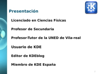 Este documento presenta las razones por las que el autor utiliza KDE. El autor enumera que KDE es 100% configurable, práctico debido a sus trucos y manejo de ventanas, ofrece buenas aplicaciones como Dolphin y Gwenview, está en constante evolución tanto en velocidad como actualizaciones frecuentes, es vanguardista con proyectos como Plasma Active y OwnCloud, y tiene una gran comunidad de usuarios. El autor concluye preguntando si tiene alguna pregunta el público y dando las gracias por su atención.