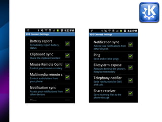 El proyecto 'KDE Connect', desarrollado por Ronny Yabar durante el Google Summer of Code 2013, permite la conexión entre dispositivos móviles y PCs para funcionalidades como control remoto de medios y transferencia de archivos. Es compatible con diversas plataformas, incluyendo Linux, Android, iOS y Jolla. Se publicó oficialmente en Google Play y se presentó a través de una demo.