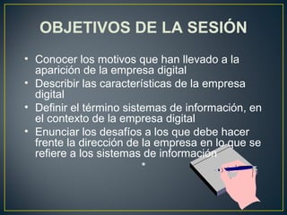 El documento describe la importancia de la información y los sistemas de información para las empresas digitales. Explica que las empresas modernas gestionan sus procesos estratégicos y activos clave a través de redes digitales y sistemas de información. Además, define varios tipos de sistemas de información como ERP, CRM y SCM que integran diferentes funciones de la empresa para mejorar la toma de decisiones y la eficiencia.