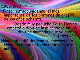 Keith Haring fue un importante pintor estadounidense de grafiti en los años 80 conocido por sus figuras esquemáticas de líneas gruesas negras y mensajes sociales. Haring creó un arte público para expresar temas universales como el nacimiento, la muerte, el amor y la guerra, y dedicó gran parte de su tiempo a obras públicas con mensajes sobre problemas sociales. Más tarde en su vida, Haring usó su arte para crear conciencia sobre el SIDA después de ser diagnosticado con la enfermedad en 1988.