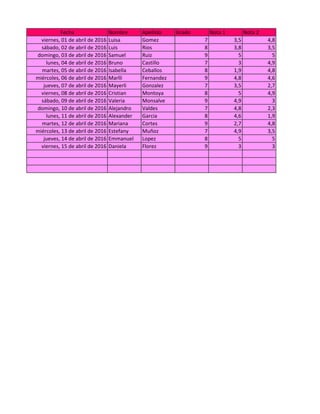El documento presenta las notas de 15 estudiantes en 3 asignaturas diferentes, con su fecha, nombre, grado y nota final. Se incluyen las notas individuales de cada asignatura y el promedio final de cada estudiante. Adicionalmente se especifican las notas más alta y más baja.