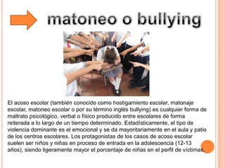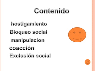 El documento describe los diferentes tipos de acoso escolar. Estos incluyen acoso psicológico como ridiculización y burlas, aislamiento social a través de prohibiciones de interactuar con otros, distorsión de la imagen de la víctima para inducir rechazo, coacción para forzar acciones contra la voluntad, y exclusión de la participación a través de segregación social. El acoso escolar se manifiesta comúnmente a través de abuso emocional y suele involucrar a estudiantes entre 12-13 años.