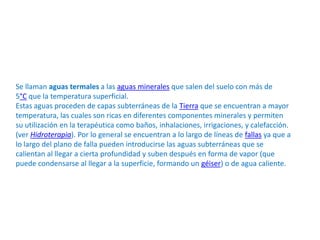 Este documento describe las aguas termales, que son aguas minerales que salen del suelo a más de 5°C que la temperatura superficial. Proceden de capas subterráneas más calientes y contienen minerales que las hacen útiles para tratamientos terapéuticos. Generalmente se encuentran a lo largo de líneas de falla geológicas y varían en temperatura desde aguas frías hasta aguas supertermales de más de 100°C.