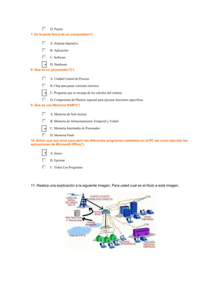 El documento contiene un examen final para el grado once del Colegio Bilingüe Lancaster. El examen consta de 11 preguntas de selección múltiple sobre conceptos básicos de informática como hardware, software, sistemas operativos, periféricos de entrada y salida como el teclado y la impresora, y componentes de un computador como la unidad central de procesamiento y la memoria RAM. También incluye una pregunta sobre la interpretación de una imagen relacionada con las intercomunicaciones a través de Internet.