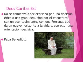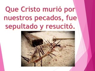 El documento habla sobre el anuncio del encuentro con Cristo. Explica que el primer anuncio de Cristo fue a través de su vida, muerte y resurrección, al revelarse como hijo de Dios. Después, los apóstoles como Pedro anunciaban el Kerygma, proclamando que Jesús fue bautizado y sanó a la gente, pero fue crucificado y resucitó al tercer día, ofreciendo el perdón de los pecados a través de su sacrificio y el espíritu santo para acompañarnos.